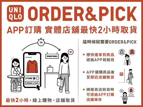 隨著數位時代來臨,人們消費不再只是單純的實體通路或網路商店,而是成為橫跨線上及線下的OMO新零售購物模式。UNIQLO本著LifeWear理念聆聽顧客心聲,推出ORDER&PICK全新服務,在網路商店或APP下單,選擇「實體店舖取貨」,最快2小時就可輕鬆取貨!