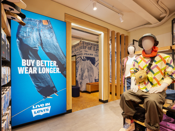Levi’s®未來丹寧旗艦店—西門旗艦館運用科技感光束,打造摩登時尚外觀;秉持品牌一貫的環保永續精神,內裝採用木質色調,帶出自然質感的舒適氛圍。