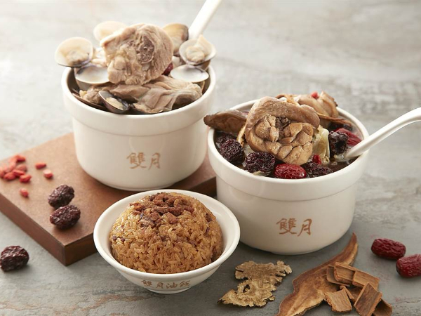 中午12點提早抵達後,午餐送上必比登推介「雙月食品社」招牌雞湯與油飯,每日直送的溫體仿土雞腿,搭配藥膳湯底與高山蔬菜,養生健康且料多實在深獲好評。隨著天氣逐漸轉冬,還可在房內品嚐「靈芝白首烏燉雞湯」或料多鮮美的「蛤蜊燉雞湯」,搭配店內招牌「雙月油飯」。